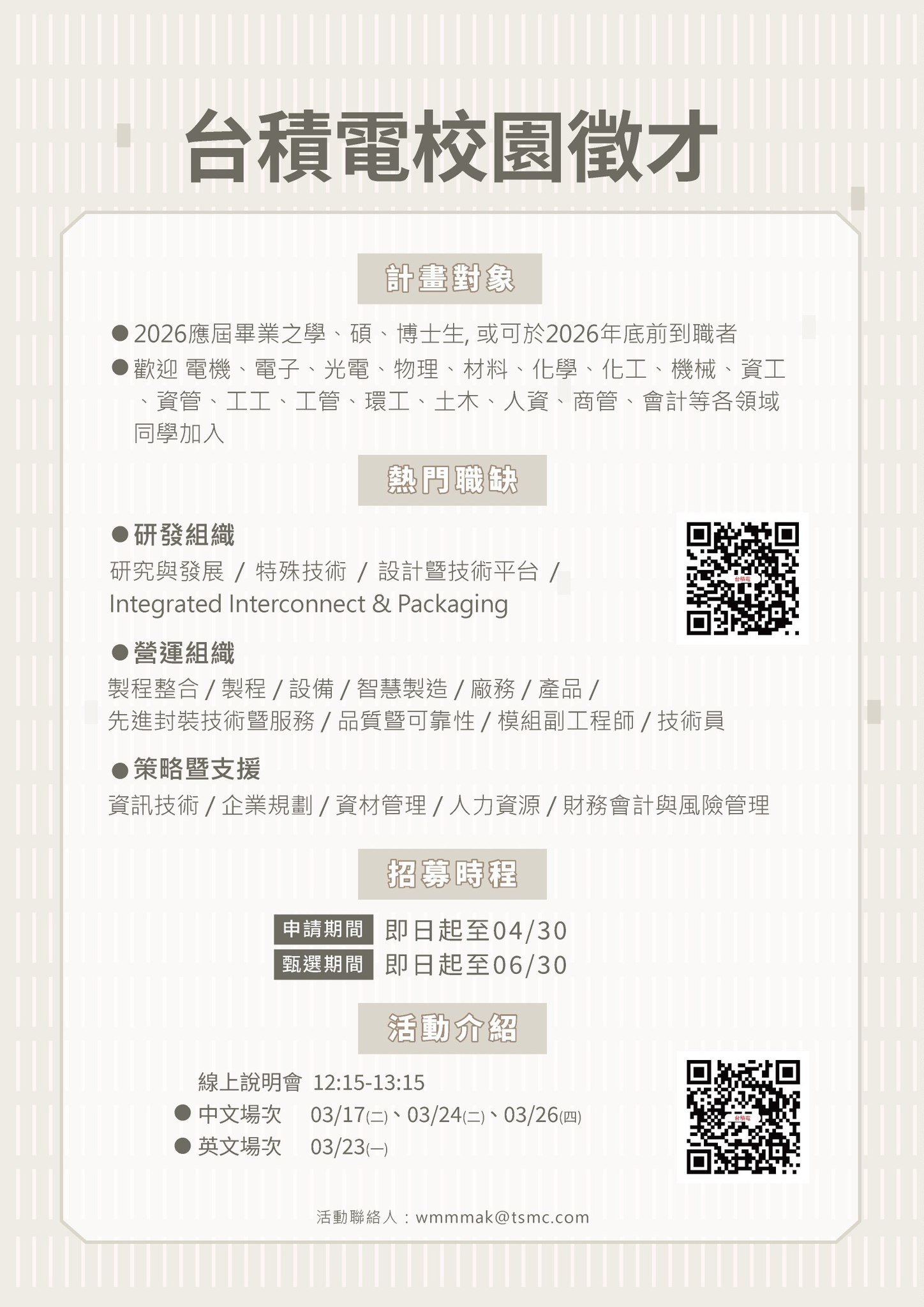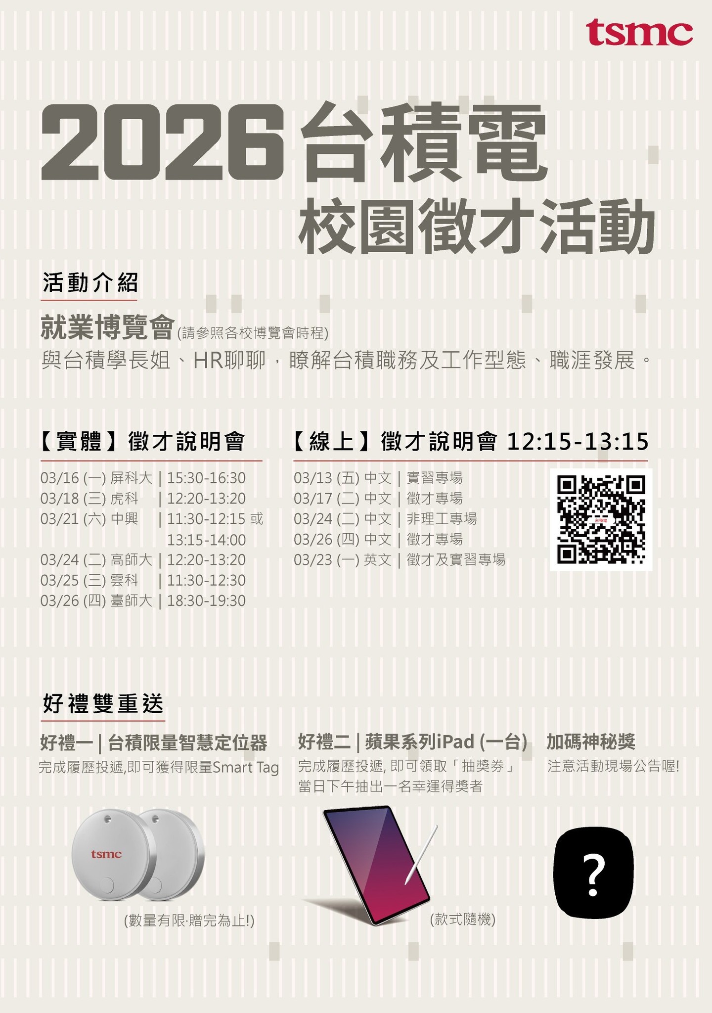 2026年台積電實習招募計畫×說明會,詳細請參閱附件。